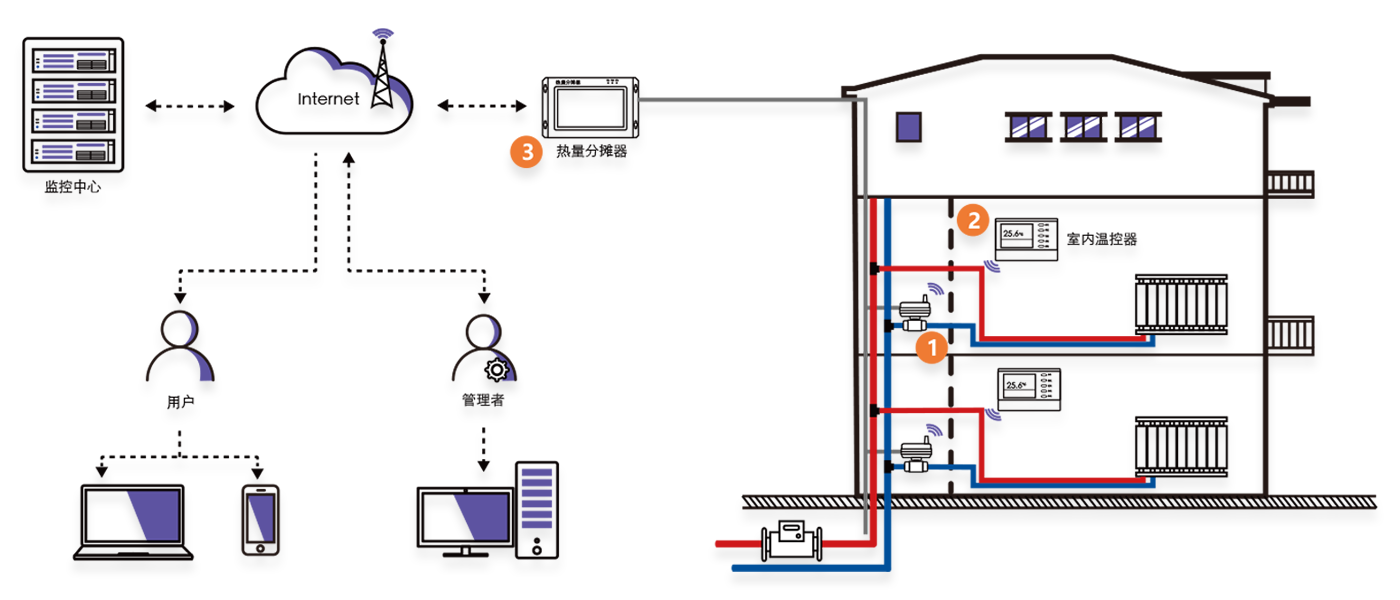 熱量分?jǐn)偲髦С譄崃勘泶?lián)、 熱量表并聯(lián)、虛擬總表等多種分?jǐn)偰J?/p>